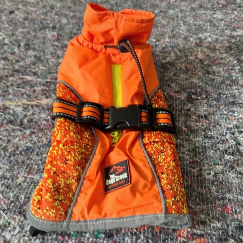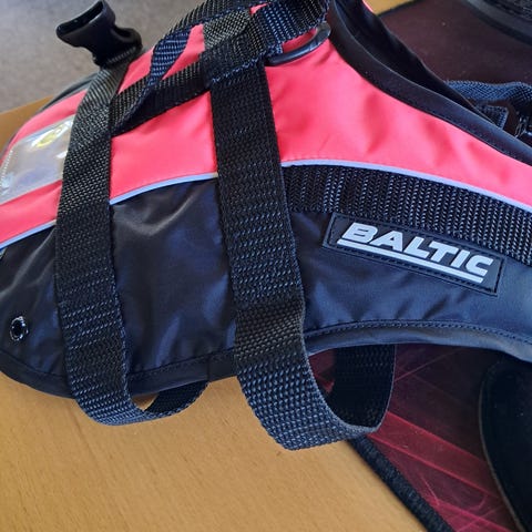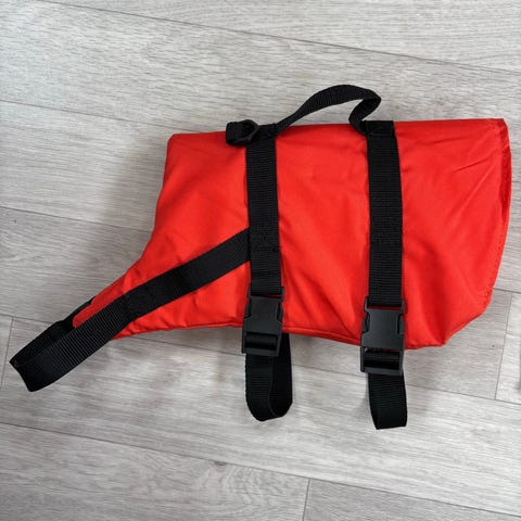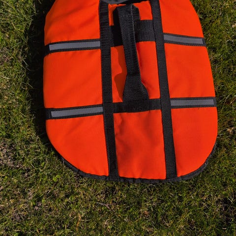 Helt ny svømmevest fra DyreLiv til hund i størrelsen medium, egnet til hunde på ca. 10-20 kg. Vesten er orange med sorte stropper og reflekser. Den har justerbare remme under maven og omkring brystet samt bærehank/fastgørelsesring på ryggen. Ryglængden er angivet til ca. 30 cm. Velegnet til brug ved vandaktiviteter, hvor hunden har behov for ekstra opdrift og synlighed.