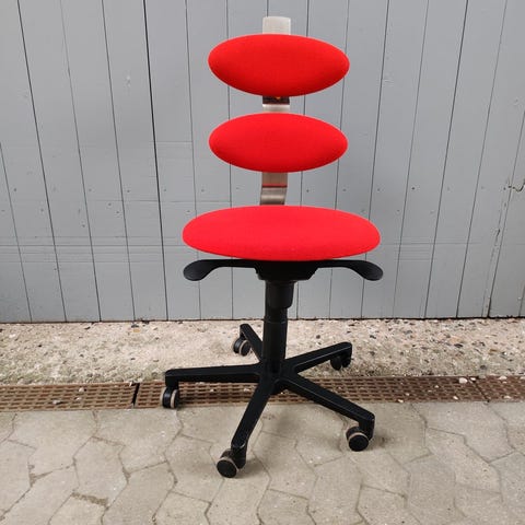 Ergonomisk kontorstol med justerbart sæde i rød polstring og sort plastikramme, ideel til komfortabel arbejdsstilling.