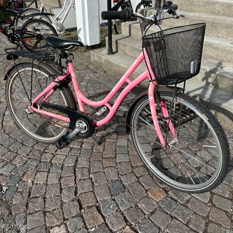 Børnecykel citybike 20" i lilla. Cyklen har lav indstigning og er udstyret med fastmonteret frontkurv, bagagebærer, kædeskærm, skærme for og bag samt støtteben. Der er reflekser på hjul og pedaler samt baglygte monteret på bagagebæreren. Velegnet som hverdagscykel til børn i skolealderen.