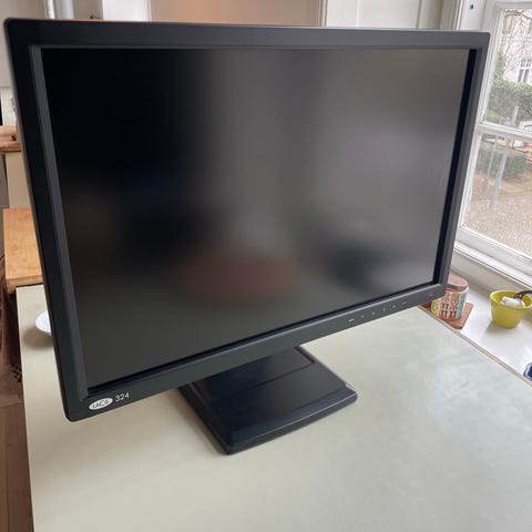Skærm på 24 tommer egnet til brug med stationær computer eller som ekstra skærm til bærbar. Skærmen står på en rektangulær fod og har et enkelt, sort design. 144 hz, inkl alle kabler. 800 kr