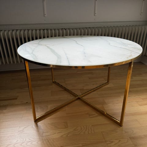 Superflot sofabord med understel, inkl. de fire ben, i guldlook og marmorlignende glasbordplade sælges. Diameter er ca. 80 cm og højde ca. 45 cm.
