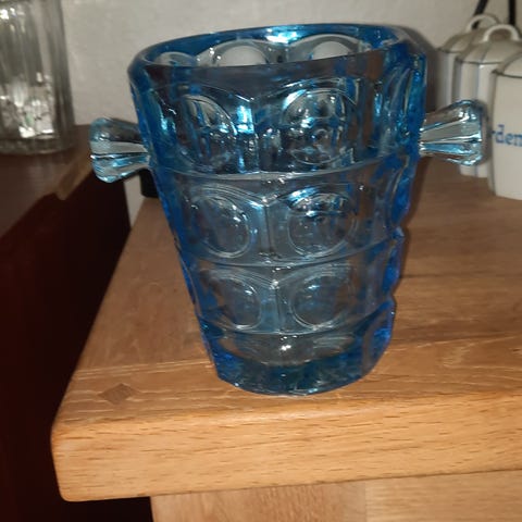 Blå glaskrukke med låg. Krukken er fremstillet i gennemfarvet blåt glas og har rund form med tilhørende låg med knop. Højden er ca. 12 cm, og indvendig diameter er ca. 9 cm. Velegnet til opbevaring af mindre ting i køkken, badeværelse eller stue.