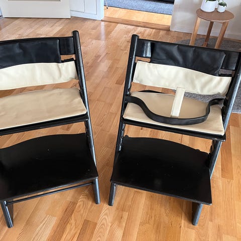 Er malet sort. Malingen er skallet af et par steder. Men stolen fungerer perfekt.