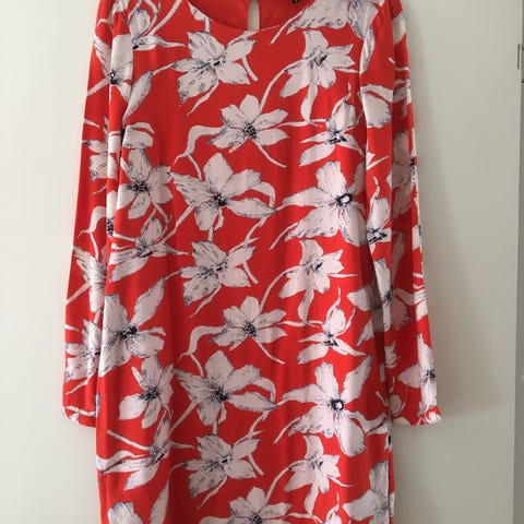 Minimum ubrugt viskose kjole/tunika i orange, hvid og sort, str. 38. Korte ærmer. Brystomkreds 106 cm, hellængde 87 cm. I taljen kan den spændes ind, hvis ønsket. Er ubrugt.