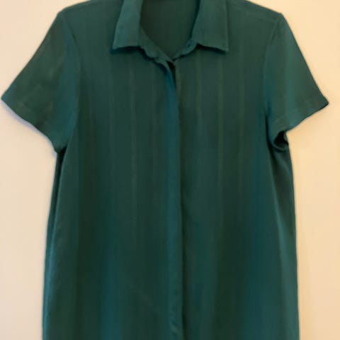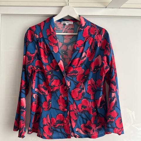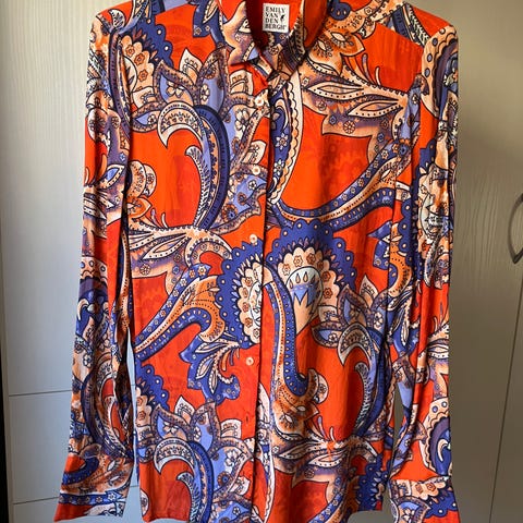 Minus skjortebluse str. 38 i lækker viskose, med mørkeblå bundfarve. Brystomkreds 102 cm, hellængde 65 cm. Brugt 1 gang.