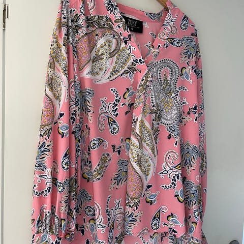 Flot, ubrugt, eksklusiv Emily van den Bergh skjortebluse str. 38 i viskose, bundfarver i orange og lilla. Brystomkreds 94 cm, hellængde 67 cm. Er ubrugt.