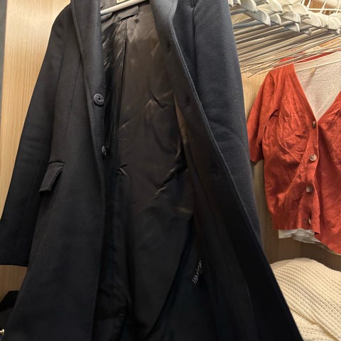 Marant Etoile over size frakke i lun uld i str. 34. Kan bruges af str 34-38. Farver er sort, grå, rød og hvid. Modellen er åben fortil og kan bruges med bælte og har lommer. Materialet er uldblanding med foret inderside.