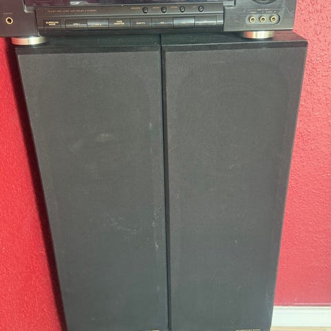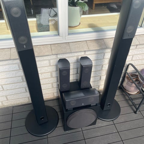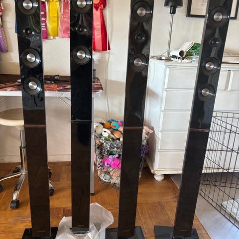 Samsung hjemmebiograf system med 4 slanke gulvhøjttalere i sort design. Systemet omfatter en central enhed/afspiller samt tilhørende høje tårnhøjttalere, der er velegnede til opsætning foran og evt. bagved lyttepositionen i stuen.