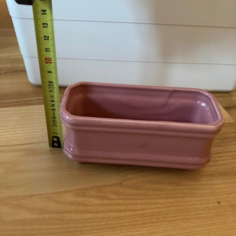 Lille Keramikpotte i blå glasur. Potten er rund med let udadbøjet kant . Højde og diameter fremgår cirka af målebåndet på billedet.