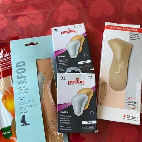 Helt nye. Jeg bruger kun venstre. Bruges ved nedsunket forfod. Man bruger gerne et nummer større end skostørrelse. Så hvis du bruger 39 så passer denne