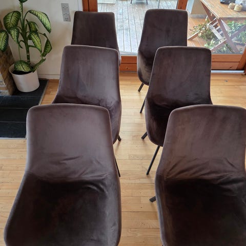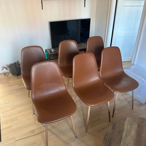 4 dining chairs in cognac colour. Very comfortable and good back support. Selling the whole set together. Bought from JYSK less than a year ago. Pickup between now and April 28th. 1000 dkk for all chairs.