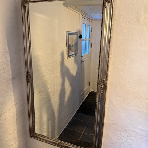 Jysk spejl i rektangulær form med sølvfarvet ramme. Spejlet har en dekoreret ramme med ornamenter i hjørner og kanter. Velegnet til ophæng i entre, soveværelse eller stue som helkropsspejl eller vægspejl.