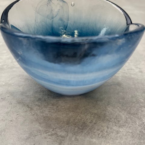 Ekstremt tung og karakterfuld glasskål i en dyb havblå/akvamarin nuance. Skålen er et lille kraftværk af glas med en vægt på over 3,3 kg og en smuk, mat finish, der giver materialet et næsten sten-agtigt, organisk udtryk.