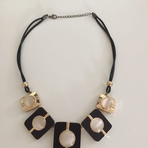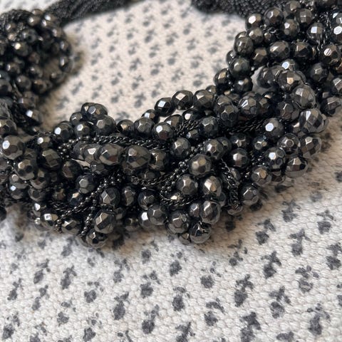 Kort halskæde med vedhæng på kæden af sorte og klare similisten. Vedhængene er “løse” på kæden. I pæn stand.