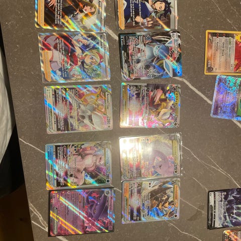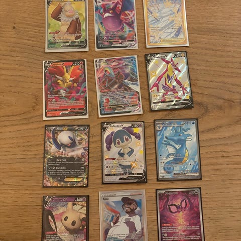 Pokémon samlekort blandet parti med forskellige holo- og V-kort. Kortene viser flere forskellige Pokémon-figurer og trænere i fuldart- og foiludgaver. Egnet til samlere af moderne Pokémon-kort, der ønsker et udvalg af kort med glans- og specialeffekter. Antal, sprog og specifikke serier fremgår af billederne.