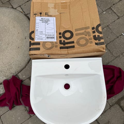 Ifö Cera håndvask, 57x43,5 cm, i hvidt porcelæn. Klassisk form med integreret hane- og overløbshul. Vægmonteres på bøjler. Gengives som modelfoto på billedet, da kassen ikke er åbnet.