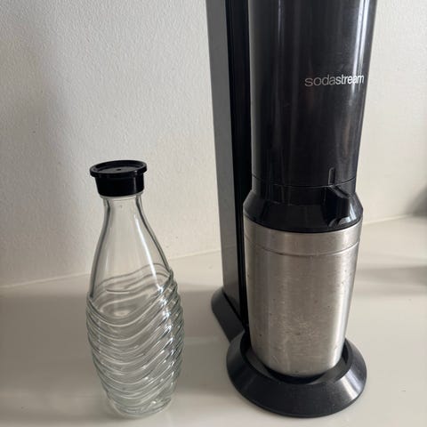 Sodavandsmaskinen er i sort plast og har en enkel, afrundet form. Der medfølger en gennemsigtig plastflaske med sort låg, som kan bruges til opbevaring og servering af danskvand eller sodavand.