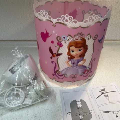 Sød børneværelses bordlampe med 4 Disney prinsesser på, Tornerose, Snehvide, Rapunsel og Askepot. Giver et flot og hyggeligt lyserødt lys fra sig, når den er tændt. Indeholder LED pære. Figurerne er lidt falmede, men det ses ikke så meget, når den er tændt. Røg- og dyrefrit hjem. Måske en gaveide? Spørg bare, hvis du vil vide noget.