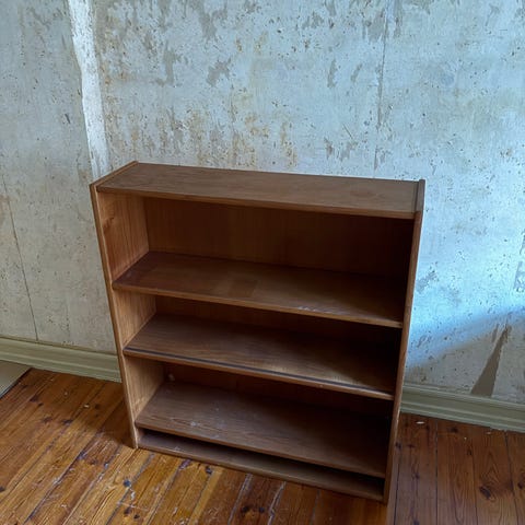 Fin bogreol i teakfiner formentlig fra sen-70’erne eller 80’erne. 6 hylder, hvoraf 4 er justerbare (bunden og den midterste er fastmonterede). Uoriginale hyldebærere. Ingen finérskader. Stammer fra rygerhjem. Bagbeklædningen er beskadiget to steder nederst (se de sidste billeder), men det ser man ikke når der er noget i den. Jeg kan muligvis hjælpe med transport i Københavnsområdet mod betaling. SE OGSÅ MINE ANDRE ANNONCER