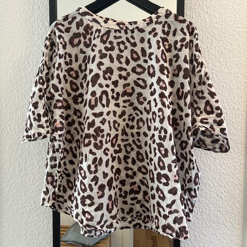 H&M bluse til kvinder i størrelse L. Blusen er fremstillet i viskose og har et multifarvet mønster med leopard-print. Dwn er rundet nedadtil, h ilkwt slanker. Modellen har korte flaterende ærmer og rund hals. Velegnet til hverdagsbrug eller som enkel overdel til både jeans, bukser og nederdele.