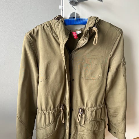 H&M jakke til kvinder i str. 42. Jakken er i farven nude med små prikker og har klassisk reverskrave, lange ærmer og enkeltknaplukning foran. Ydermaterialet er primært polyester, og jakken er fuldt foret. Velegnet som let blazerjakke til hverdag eller arbejde.