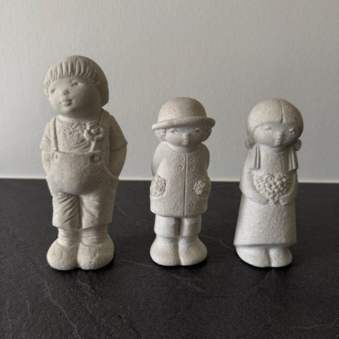 Vintage Marbell Stone Art fra Belgien. Keramikfigur barn på gyngehest. Den er udført i lys kompositsten eller sandsten med en enkel og afrundet formgivning. Under bunden ses mærkat med teksten marbell velegnet som dekoration på hylde, reol eller bord i hjemmet.