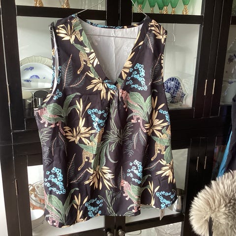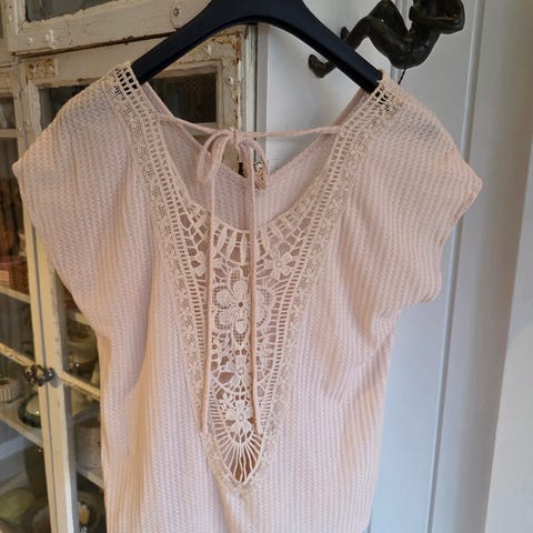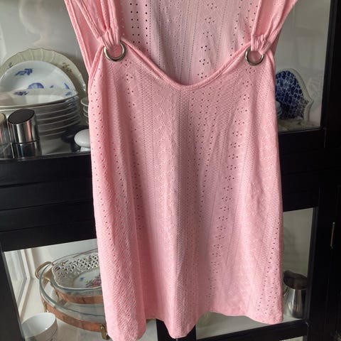 Shein top til kvinder i størrelse XL. Toppen er lyserød og fremstillet i polyester med mønstret, hulmønstret struktur i stoffet. Modellen er ærmeløs med løs pasform og spids afslutning forneden på ryggen. Ryggen har overlappende lag, der giver et draperet udtryk. Velegnet som sommertop eller til lag-på-lag styling.