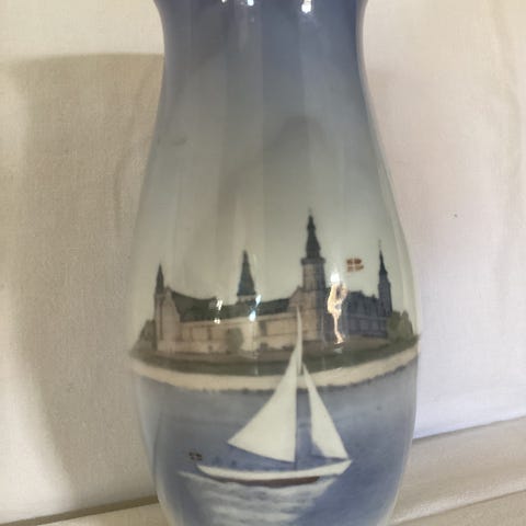 Bing & Grøndahl vase i porcelæn med maritimt motiv. Vasen er dekoreret med sejlbåd og havlandskab i blå og hvide nuancer. Indersiden er hvidglaseret, og formen er let svungen med bred åbning foroven. På bunden ses Bing & Grøndahls stempel samt modelnummer 810-5440. Velegnet som dekorativ gulv- eller bordvase til blomster eller som pyntegenstand i hjemmet.