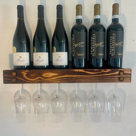 Håndlavet hylde af træ (fyr) til flasker og glas.