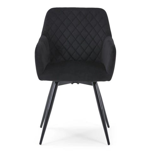 Spisebordsstol med armlæn og drejefunktion Årsag til Outlet: Brudt emballage Mange mennesker har en presset hverdag, hvor de har brug for at komme hjem og slappe af i rolige omgivelser. Her har møblerne i hjemmet en stor betydning. En stol med armlæn og drejefunktion giver dig mulighed for at hvile armene og koble bedre af, uanset om det er ved spisebordet eller et skrivebord. Carlo drejestol til spisebord passer godt ind i alle indretninger. Carlo - Sort velour drejestol 360 grader med armlæn Carlo er en helt unik, rummelig og flot spisebordsstol med armlæn. Drejestolen er lavet af velour og matte pulverlakeret ben, hvilket der sammen med størrelsen på stolen, gør den virkelig alsidig og både kan bruges som spisebordsstol, loungestol eller lænestol til stuen og/eller skrivebordsstol til kontoret. Stolen er ydermere godt polstret, hvilket gør at siddekomforten er behagelig og man kan let sidde i mange timer uden at føle ubehag. Her er virkelig tale om en unik stol med armlæn, som ikke findes andre steder til samme pris. Drejestol med armlæn passer til alle vores spiseborde og kan skubbes helt ind under bordet. Stolen fås i flere forskellige farver og derfor er der noget for enhver smag. Drejestolen kan dreje 360 grader, hvilket optimere sidekomforten for funktionaliteten i spisebordsstol, da det er nemmere at dreje sig ud fra bordet når man skal rejse sig. Rengøring og pleje: velour er et slidstærkt materiale, der er let at vedligeholde og rengøre. Velour kan dog ikke tåle at blive vasket. Vi anbefaler derfor, at du børster stoffet, og for at undgå pletter og snavs anbefaler vi, at du imprægnerer stolen med en tekstilimprægnering. Den fås lige her. Se resten af vores udvalg af spisebordsstole her