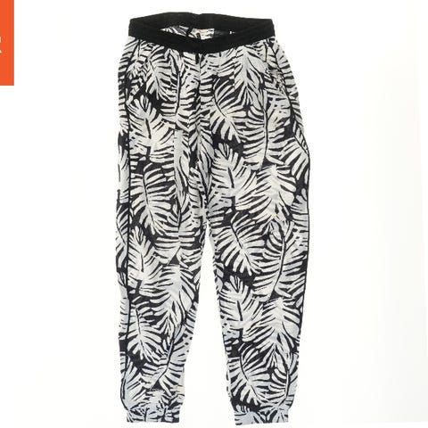 Tynde blå sommerbukser med et hvidt mønster. De har elastik i taljen og anklerne samt en snor til justering. Der er hvide kantdetaljer langs siderne. Let og afslappet look.