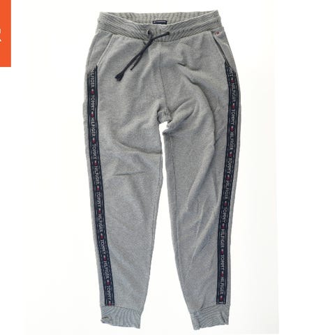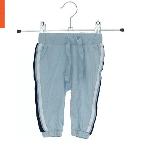Mørkeblå træningsbukser med hvide striber langs siderne. Bukserne har en elastisk talje med snøre. De er lavet af blødt materiale og har en afslappet pasform.