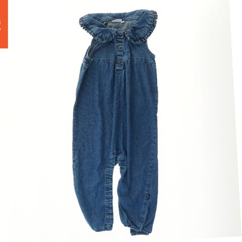 En langærmet heldragt i blå farve. Dragten har knapper langs fronten. Der er et lille lastbiltryk på ryggen.