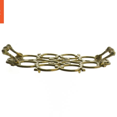 En dekorativ vintage kagespade med udsmykket mønster og gylden farve. Den er lavet af metal med en perforeret bladform for at lette servering af kager. Håndtaget er glat og ergonomisk for komfort under brug.