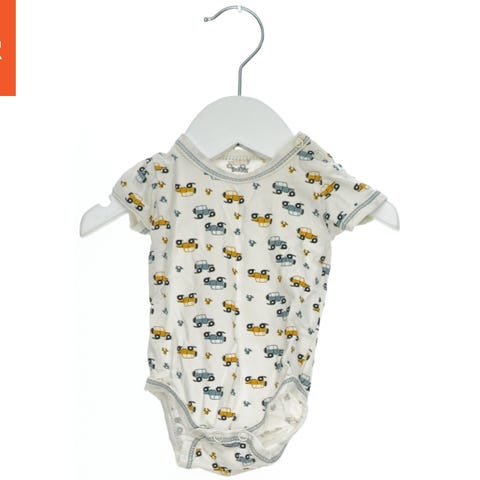Denne kortærmet bodystocking er hvid med et mønster af biler og blomster i forskellige farver, herunder grå og gul. Bodystockingen er designet med trykknapper ved skulderen og bunden, som gør det nemt at tage af og på. Den er ideel til babyer og småbørn.