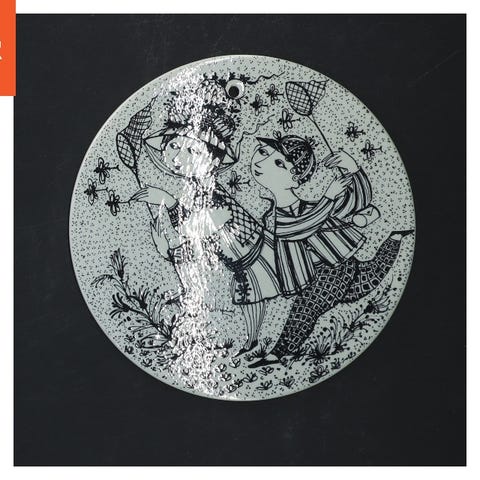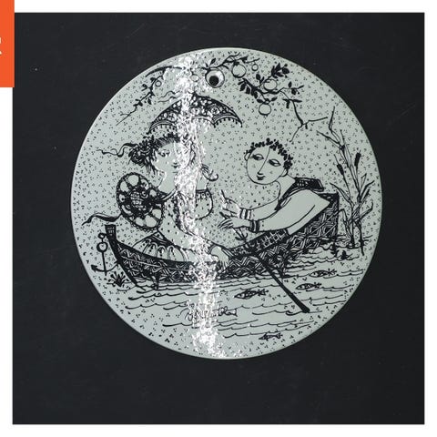 Denne genstand er en dekorativ vægskive lavet af keramik, med en diameter på 15 cm. Den har et sort-hvidt tryk med et stiliseret motiv af to figurer. Bagsiden har en tekst med 'September Saison Start' og en indgraveret signatur. Der er et hul øverst på skiven til ophæng.