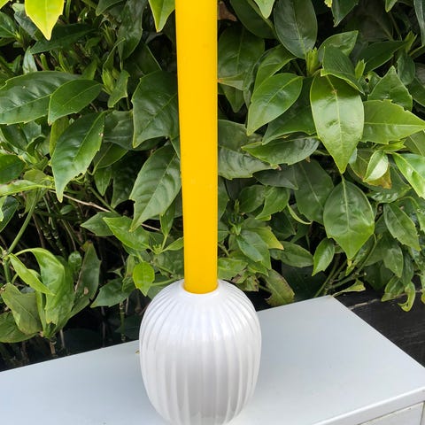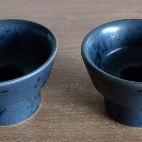 Lysestage fra Ombria-serien er designet af Anders Arhøj for Kähler. Kan bruges til både kronelys, fyrfadslys og bloklys på 5 cm i dia.. Glasuren er grå med sorte nister. H. 5 cm, dia. 8 cm. Er som ny.