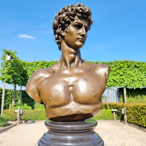 Statuen er håndlavet i bronze med en poleret marmorbund, hvilket giver den både en stærk visuel tilstedeværelse og