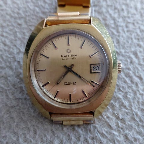 Certina Blue Ribbon automatisk herreur med 14K guld (585) kasse, Ø36 mm, champagne-farvet urskive, læderrem, schweizisk produktion i 1960erne/1970erne, automatisk urværk, bagside i stål. Klik på den blå "gå til varen" knap, for at købe eller byde på denne vare. Den samlede pris vil blive vist inden du afgiver dit bud.
