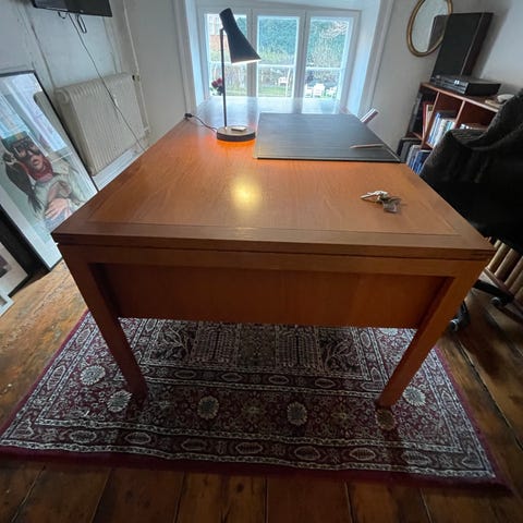 Dette imponerende kontor-skrivebord i massivt træ er et fascinerende eksemplar af ældre møbelformgivning, som kan knyttes til slutningen af 1800-tallet eller starten af det 20. århundrede (vintage/industrielt kontordesign).