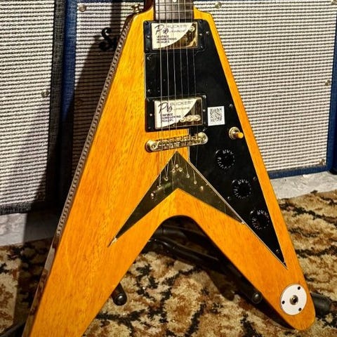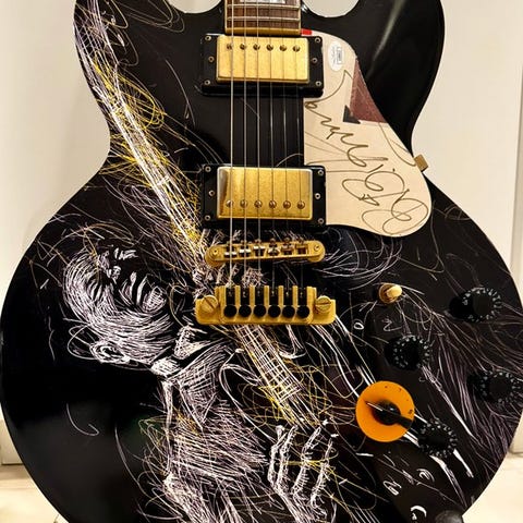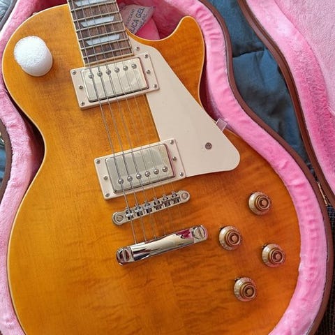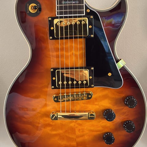 Lentini elektrisk guitar med sienne-ryg og sider i valnød, top i figureret valnød, mahognihals, scale 628 mm, 22 bånd, mat og blank finish i blanding, ARM låsende stemmeskruer, Tune-o-Matic (ARB-1) bro, Epiphone Standard Pro pickup, Erny Ball strenge 10/46, længde 97 cm, bredde 34 cm, vægt 3,100 g, i fremragende fysisk stand, testet og i funktionel stand, leveres med et robust etui. Klik på den blå "gå til varen" knap, for at købe eller byde på denne vare. Den samlede pris vil blive vist inden du afgiver dit bud.