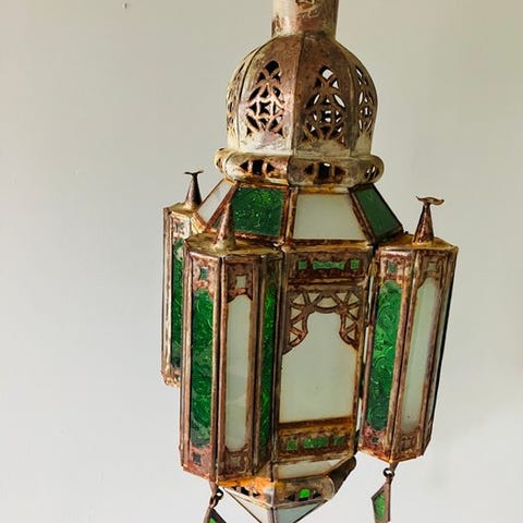 Granadinisk hængelampe fra Spanien, messingskonstruktion med forgyldt messingsfinish og orange-polykromt glas, 18 cm bred og dyb, 112 cm høj, fra 1970–1980, i god brugt stand med få ælde-tegn og i funktion. Klik på den blå "gå til varen" knap, for at købe eller byde på denne vare. Den samlede pris vil blive vist inden du afgiver dit bud.