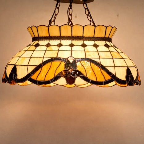 La pieza está construida con una estructura de latón o metal patinado, que ensambla mediante la técnica tradicional de soldadura diversos paneles de vidrio. Presenta una combinación de vidrios catedral en tonos azul cobalto, rojo rubí y ámbar, que enmarcan paneles centrales de vidrio transparente para maximizar la