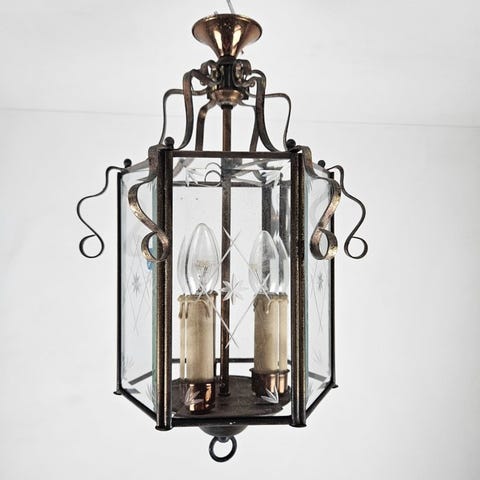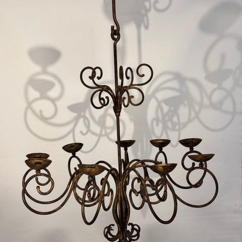 Ett lysekrona i smedet jern i middelalderstil med kæder og blomster. Sælges som til revision, men afmonteret og fungerende. Ideel til country- og rustikke miljøer. Vægten vidner om genstandens kvalitet, cirka 7 kg. Som på billedet.