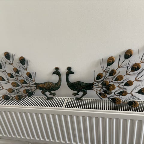 En flot udformet bronzevægdekoration. En gren med fire smukke fugle på. Flot dekoration. Den har følgende mål (+/-):
