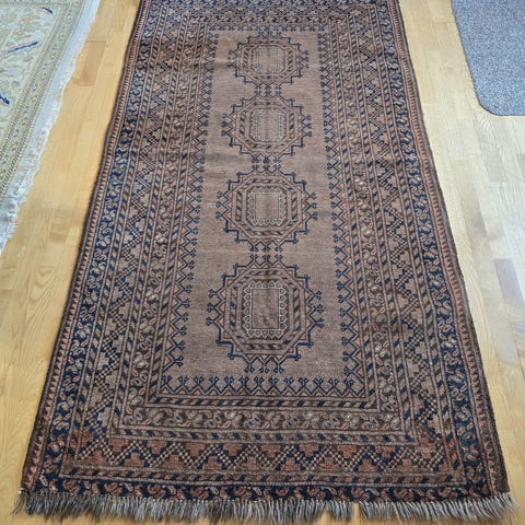 Vintage afghaner tæppe, uld på bomuld, håndknudet, oprindelse Afghanistan, mål 190 cm × 106 cm, 21. århundrede, generelt i god stand, ikke professionelt renset. Klik på den blå "gå til varen" knap, for at købe eller byde på denne vare. Den samlede pris vil blive vist inden du afgiver dit bud.