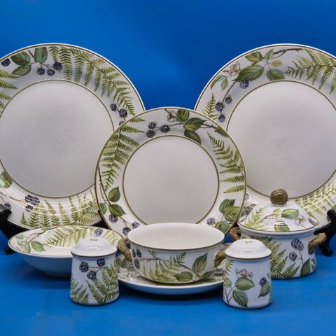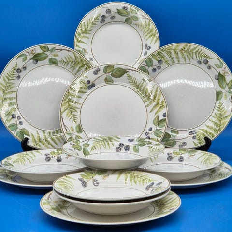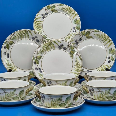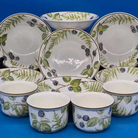 til salg står et 17-delt spise-service fra det traditionsrige mærke Villeroy & Boch fra serien „Forsa“. Settet imponerer med sit elegante naturdesign med brombær og bregneblade samt den høje kvalitet i robust Vitro-porcelæn.