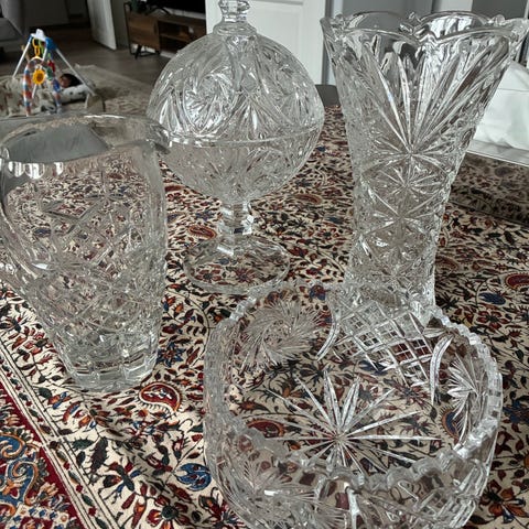Krystallet har en smuk glans, hugningen er tydelig og dyb. Sættet er i meget god stand, uden ridser eller skår, og skeerne er originale.