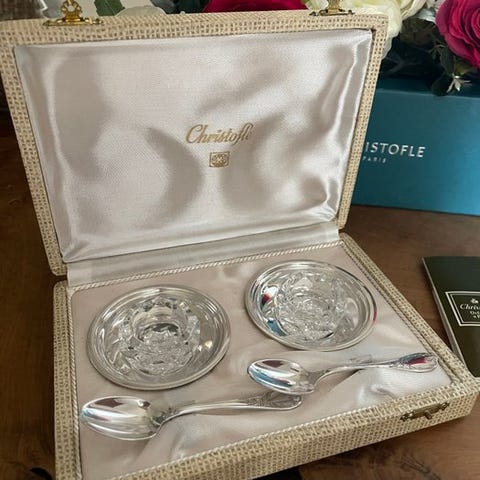 Meget elegantt sæt signeret Saint-Louis, der består af to saltbægre i skåret krystal med strålende mønster, ledsaget af deres to små forgyldte skeer, præsenteret i sin originale æske.