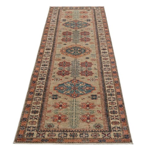 Håndflettet designer-tæppe fra Pakistan i uld på bomuld, model Kazak – Meisterstück – New, 305 × 83 cm, beige og orange, 21. århundrede, i særdeles god stand og professionelt renset. Klik på den blå "gå til varen" knap, for at købe eller byde på denne vare. Den samlede pris vil blive vist inden du afgiver dit bud.